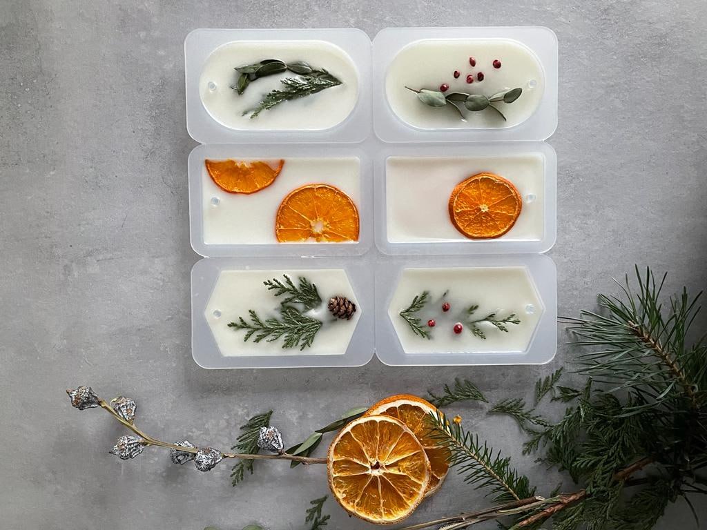 Когда воск полностью растопится, добавляем в него отдушку и разливаем по формам. Формы не глубокие, поэтому воск в них быстро застывает, мы рекомендуем заливать ячейки по очередности, чтобы успеть поработать с декором каждой из них. Суммарно на все ячейки уходит около 170 гр воска.