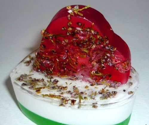 Вылейте красную основу в форму «Стрела купидона». Дождавшись появления на поверхности пленки, посыпьте мыло сухоцветами. Оставьте при комнатной температуре до полного застывания. Выньте мыло из формы. Аккуратно обрежьте стрелы - они нам не понадобятся.