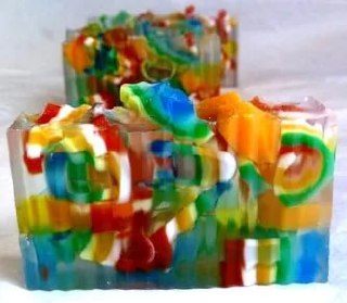 Вот какое оригинальное мыло можно сделать из мыльных обрезков. Проявите фантазию при подборе цветов разноцветных кусочков, а также цвета основной массы. Оригинально получается, если и для заливки также использовать массу разных цветов, заливая их слоями, к примеру, один слой одноцветной основы, второй слой с вкраплениями разноцветных кусочков. Желаем творческих успехов!