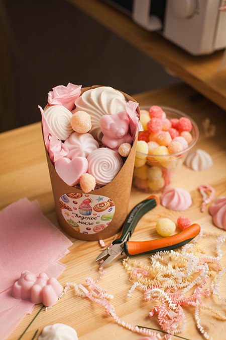 В букетах из мыльных цветов пустоты прикрывают маленькими букетиками из искуственных веточек, связанными тонкой проволокой 0,6мм.