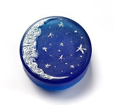 Перелейте мыло в форму. Дайте ему остыть. Когда оно достаточно застынет, но будет еще мягким, при помощи острой нагретой на огне иголки или ножа нанесите на поверхность узор в виде месяца и звезд.