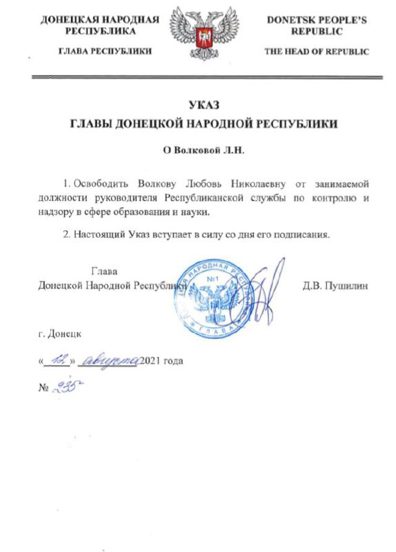 ❕ Указом Главы ДНР №235 от 12 августа 2021 года Волкова Любовь Николаевна освобождена от занимаемой должности руководителя Республиканской службы по контролю и надзору в сфере образования и науки.