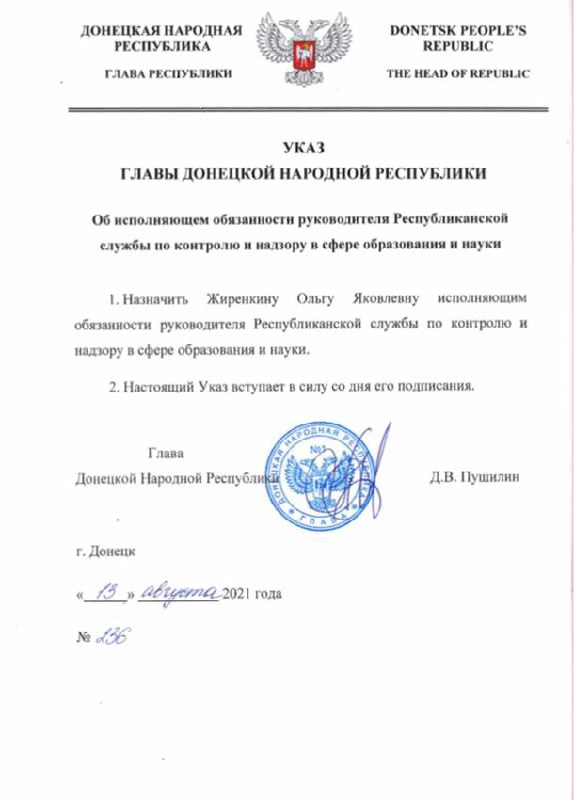❕ Указом №236 от 13 августа 2021 года Глава ДНР назначил исполняющим обязанности руководителя Республиканской службы по контролю и надзору в сфере образования и науки Жиренкину Ольгу Яковлевну.
