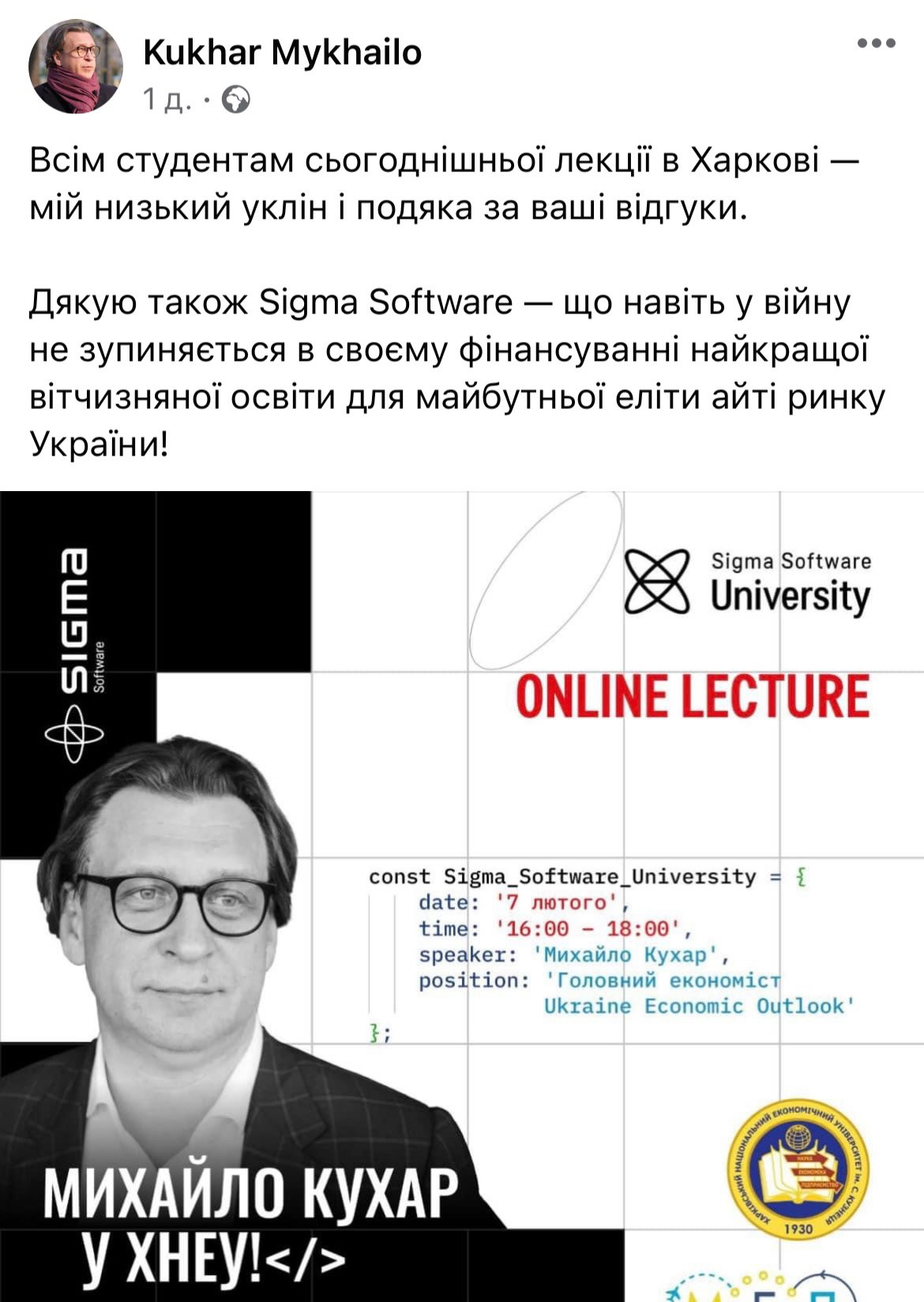 Обожнюємо таку синергію – коли задоволення від лекції отримують не лише студенти, а й сам лектор. І співорганізатори Sigma Software University разом з Харківським національним економічним університетом імені Семена Кузнеця та Факультетом МЕП, звичайно теж 😊