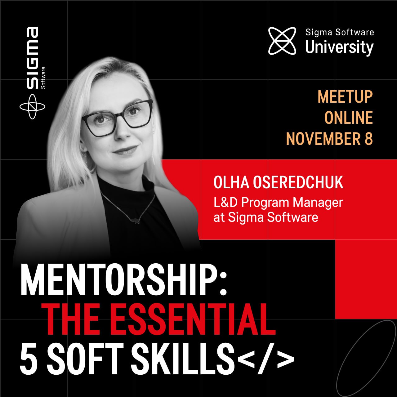 На нашому безкоштовному мітапі Ольга Осередчук, L&D Program Manager у Sigma Software, розкаже саме про найважливіші софт скіли, які потрібно розвивати та вдосконалювати, щоб стати справжнім профі в менторстві.