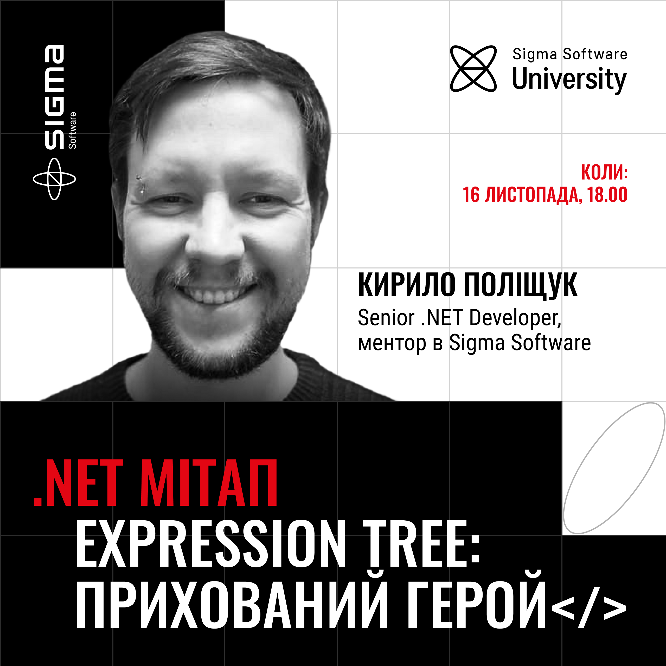 Ми запрошуємо .NET спільноту брати активну участь у презентації та долучитися до діалогу зі спікером Кирилом Поліщуком, Senior .NET розробник в Sigma Software та однодумцями. Обіцяємо цікаву, корисну та продуктивну бесіду, а після завершення мітапу, ви вийдете із розумінням, як саме працюють Expression Trees та як саме їх застосовувати на своєму проєкті.