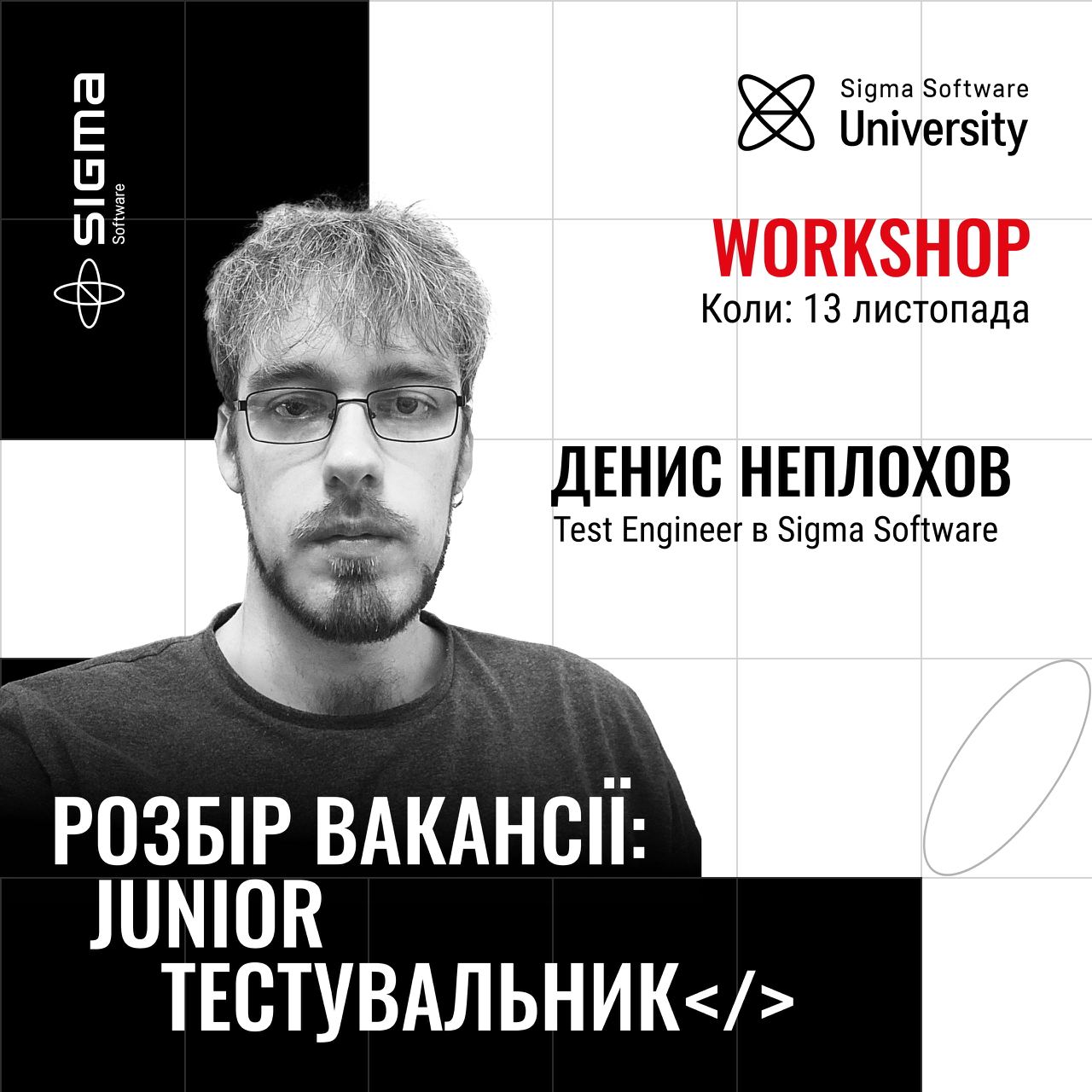 Запрошуємо тебе на безкоштовний воркшоп з Денисом Неплоховим, ISTQB® Certified Test Manager та Test Analyst; Test Engineer в Sigma Software. Денис провів 100+ співбесід на ці посади, тому ти отримаєш цінну інформацію безпосередньо від першоджерела.