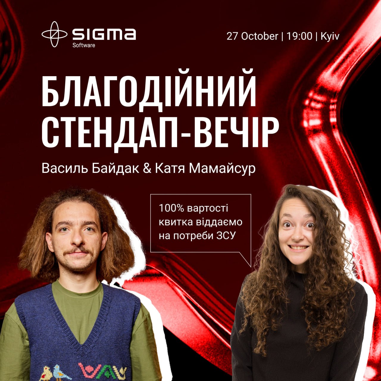 Запрошуємо тебе на благодійний стендап-вечір з Василем Байдаком та Катею Мамайсур, який організовує Sigma Software!