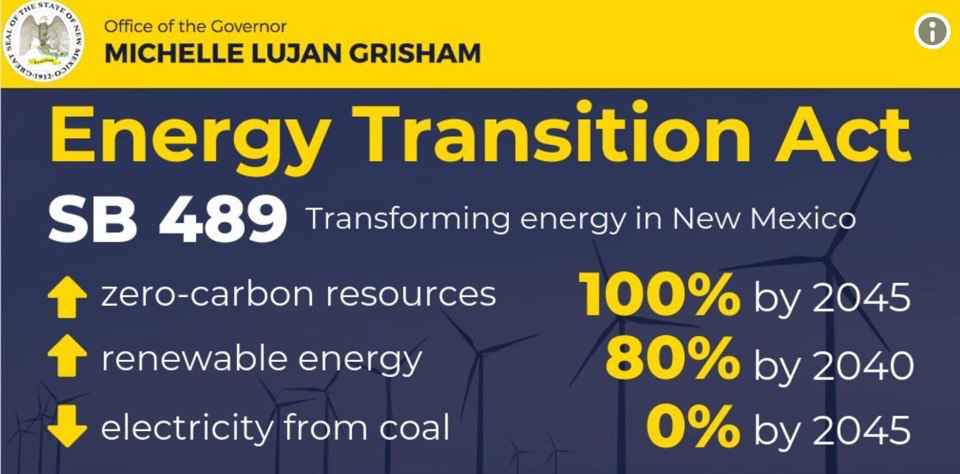 Законодательный орган штата Нью-Мексико, New Mexico House, принял закон SB489 (Energy Transition Act), в соответствии с которым штат должен перейти на использование исключительно чистой, безуглеродной энергии к 2045 году. Кроме того, закон предусматривает, что доля ВИЭ в снабжении электроэнергией штата должна достичь 80% к 2040 году.