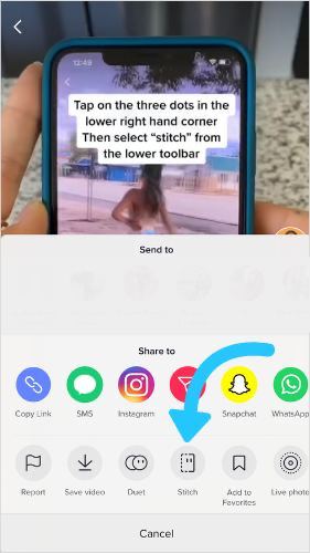 Шаг 1: Когда вы найдете видео, которое хотите сшить, нажмите на значок "Поделиться" (стрелка) в правом нижнем углу экрана, среди возможных функций будет “Stitch”