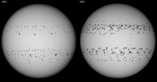 "This composite includes 110 solar images captured in 2021 and 159 in 2022," says Leon. "Nearly all days with major sunspots are present. Although this is not a scientific controlled study, variables such as cloudy days and holiday interruptions tend to even out in the large number of observations. The disparity between the two years agrees well with developing Solar Cycle 25."
