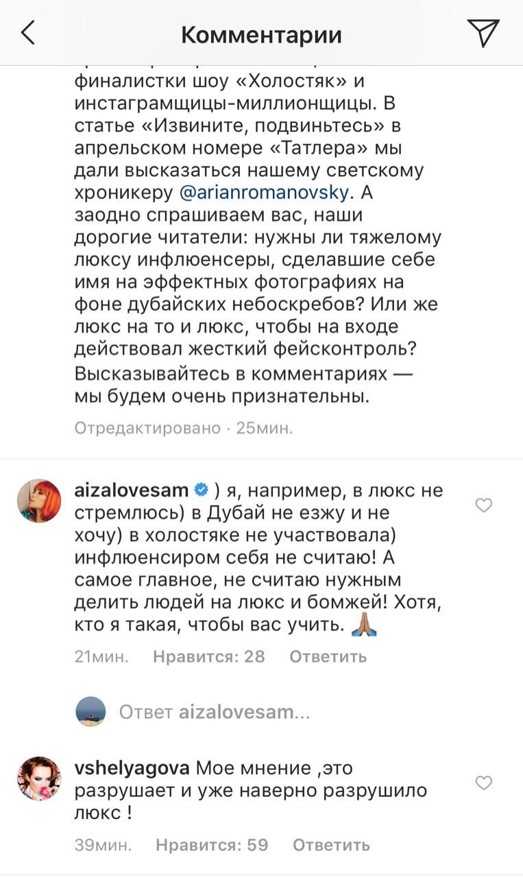 Ребята, началось. Ну и пламя мы разожгли, подстебнув Vogue, что у них на юбилее тусуются героини “Холостяка” и инстазвезды с Урала. Conde Nast, естественно, решил защититься в виде статьи Ариана Романовского на тему того, что моде нужны не зашкварные лица, а свежая кровь, пусть и "нищая". И, казалось бы, на этом можно было бы закончить полемику, но нет. Роскошный пласт "старичков" светской Москвы возмутился присутствием на страницах глянца "нищебродок". "Мое мнение, это разрушило люкс!" — возмутилась жена главы "Ритуал-сервиса" Виктория Шелягова. "Не считаю нужным делить людей на люкс и бомжей!" — добавила масла в огонь представительница "новеньких" Айза Анохина. Ждем от рэперши дисс на "Татлер".