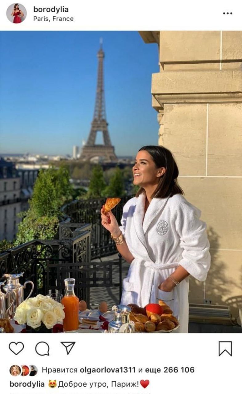 "Доброе утро, Париж!", — говорит Ксения Бородина, радуясь круассану на балконе отеля Plaza Athenee, принадлежащего султану Брунея.