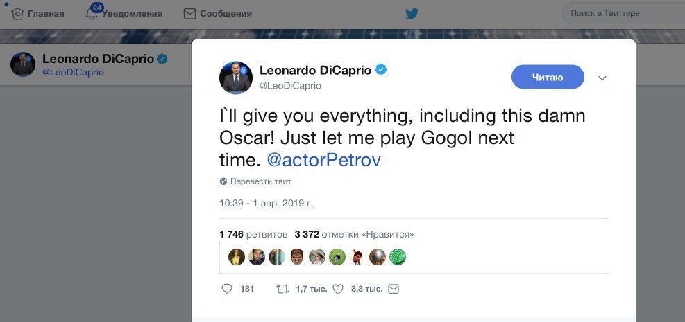 В Сети завирусился скриншот якобы из твиттера Лео, который просит Сашу Петрова уступить ему роль в сериале "Гоголь" в обмен на заветную статуэтку. Пока на ТВ-3 показывают продолжение с не вошедшими в полнометражку эпизодами, Александр судорожно пролистывает телефонный справочник, бормоча "звоните ДиКаприо..." 🌚