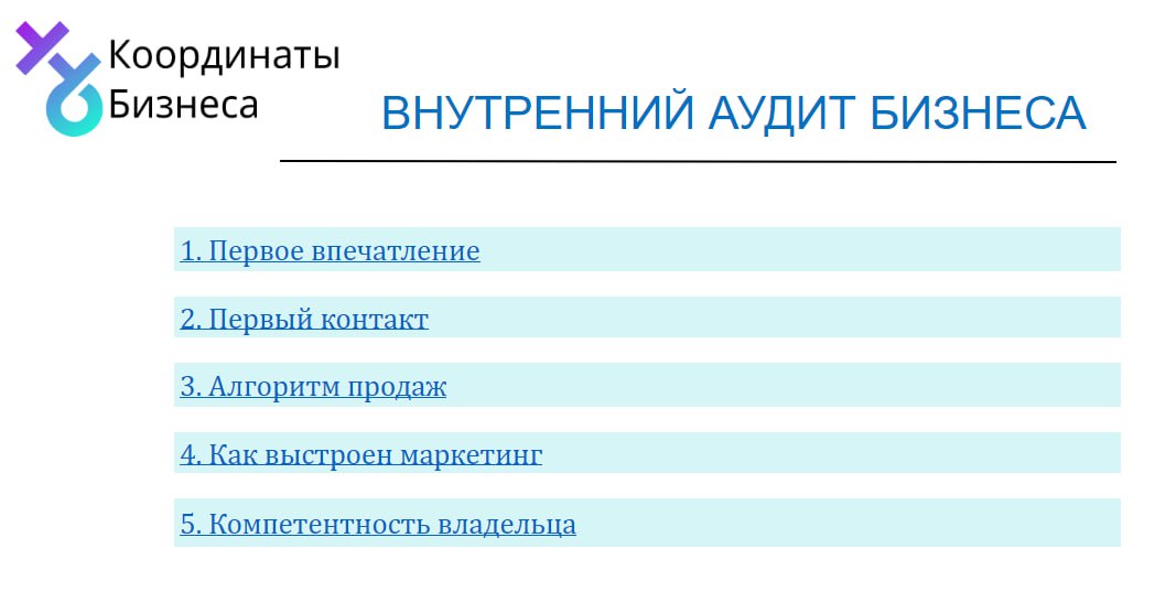- Шаблон для самостоятельного аудита поможет комплексно оценить: продажи, маркетинг, сервис, найм и многое другое. Такая диагностика позволит выявить сильные и слабые места в бизнесе. Что нужно "подлечить", для того чтобы масштабироваться, наладить плотный поток клиентов.