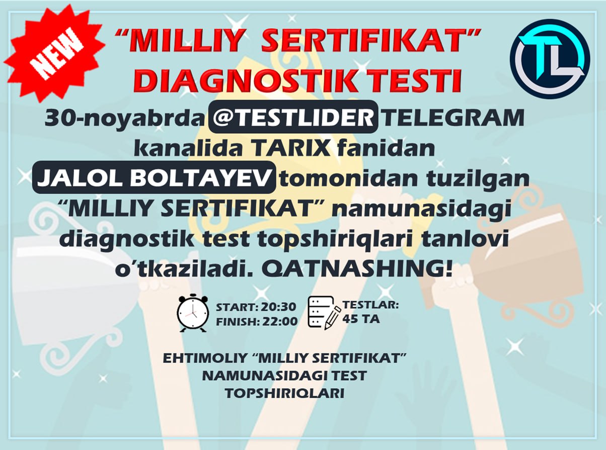 Eslatma❗️Testda qatnashish uchun @TESTLIDER kanaliga a’zo bo‘lishingiz va ushbu postni do‘stlaringizga tarqatishingiz kerak.