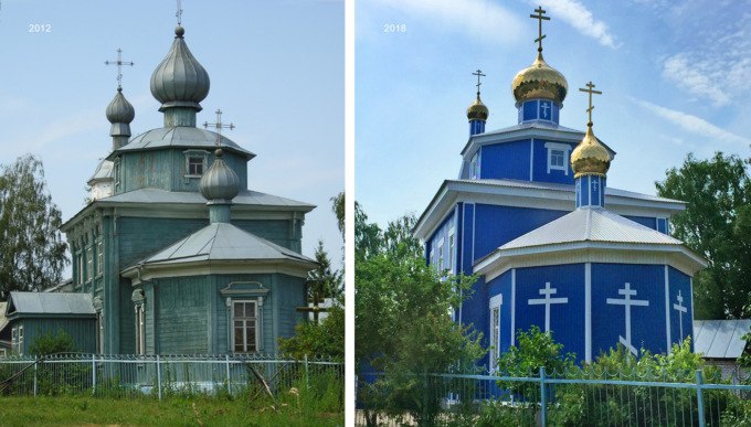 Деревянный храм в Чувашии пережил революцию, СССР и перестройку, а в 2017-м его обшили синим профильным листом и поменяли окна на стеклопакеты.