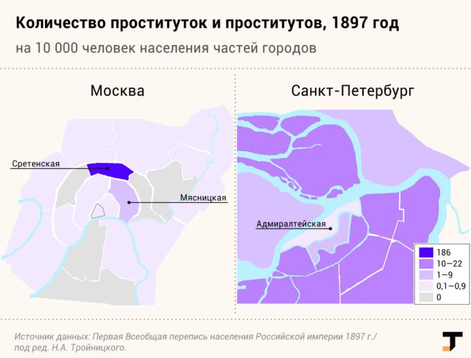 Вспоминаем, как проходили переписи в истории России и что интересного они выявили. Например, на этой картинке изображено распределение проституток по районам в Москве и Петербурге — были времена, когда их официально подсчитывали.