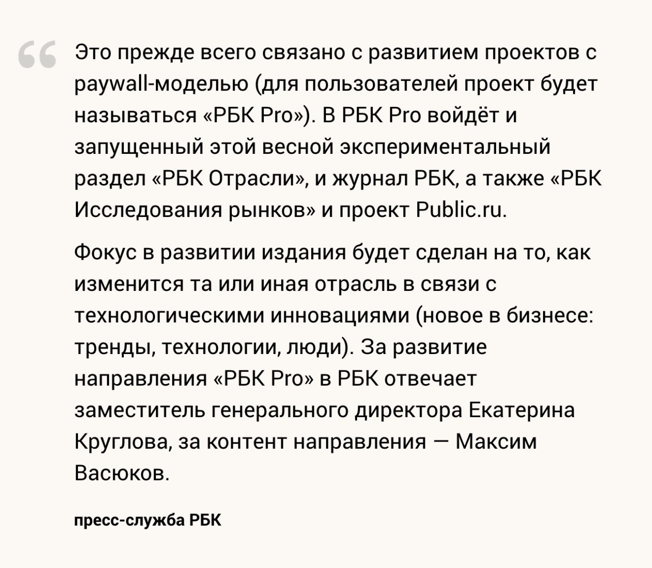 В журнале РБК всё меняется: официально из-за введения пейвола, неофициально — ради сокращения расходов. В холдинге нам подтвердили, что издание будет выходить в два раза реже (раз в два месяца), и назвали всё это «внутренней реорганизацией».
