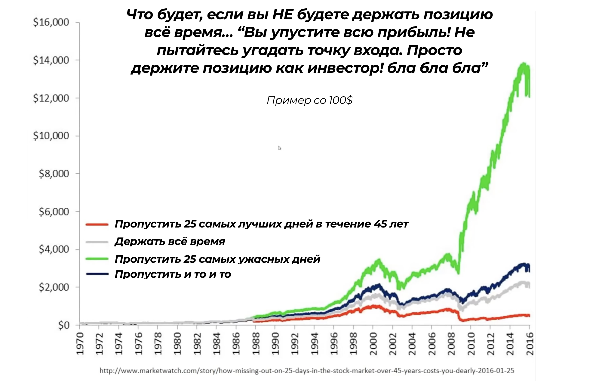 Что будет, если вы НЕ будете держать позицию всё время… “Вы упустите всю прибыль! Не пытайтесь угадать точку входа. Просто держите позицию как инвестор”