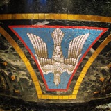 St. Joseph, Garden City, NY, Yeshua statue with fleur de lis symbol around him, and below are two marble and mosaic symbols of a unicorn and maybe a rooster?🤷🏻♀️