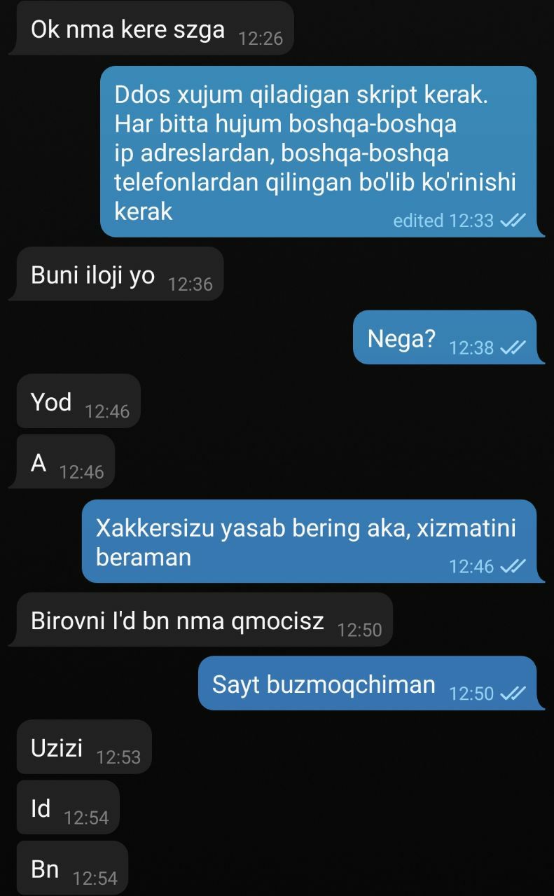 Shunday qilib desangiz, kechagi "xakker" bilan yozishgandim. Menga "xakkerlik xizmatlari ro'yhati"ni jo'natdi. Menimcha rostdan 3000ta chiqsa kerak, chunki bitta xizmatni bitta harfini o'zgartirib yana yozavergan. U ko'rsatadigan "xakkerlik xizmatlari" quyidagicha ekan: qadamlar evaziga giglarni vzlom qilish, telegramda atrofingdagi odamlarni topish, nakrutka qilish, arzon megabayt olish, amerika nomerga telegram ochish, nikni ko'rinmas qilish, ukraina nomerga telegram ochish, bioga soat qo'yish, rossiya nomerga telegram ochish va hokazo. Ular orasida php so'zi ham bir ikki marta ishlatildi.