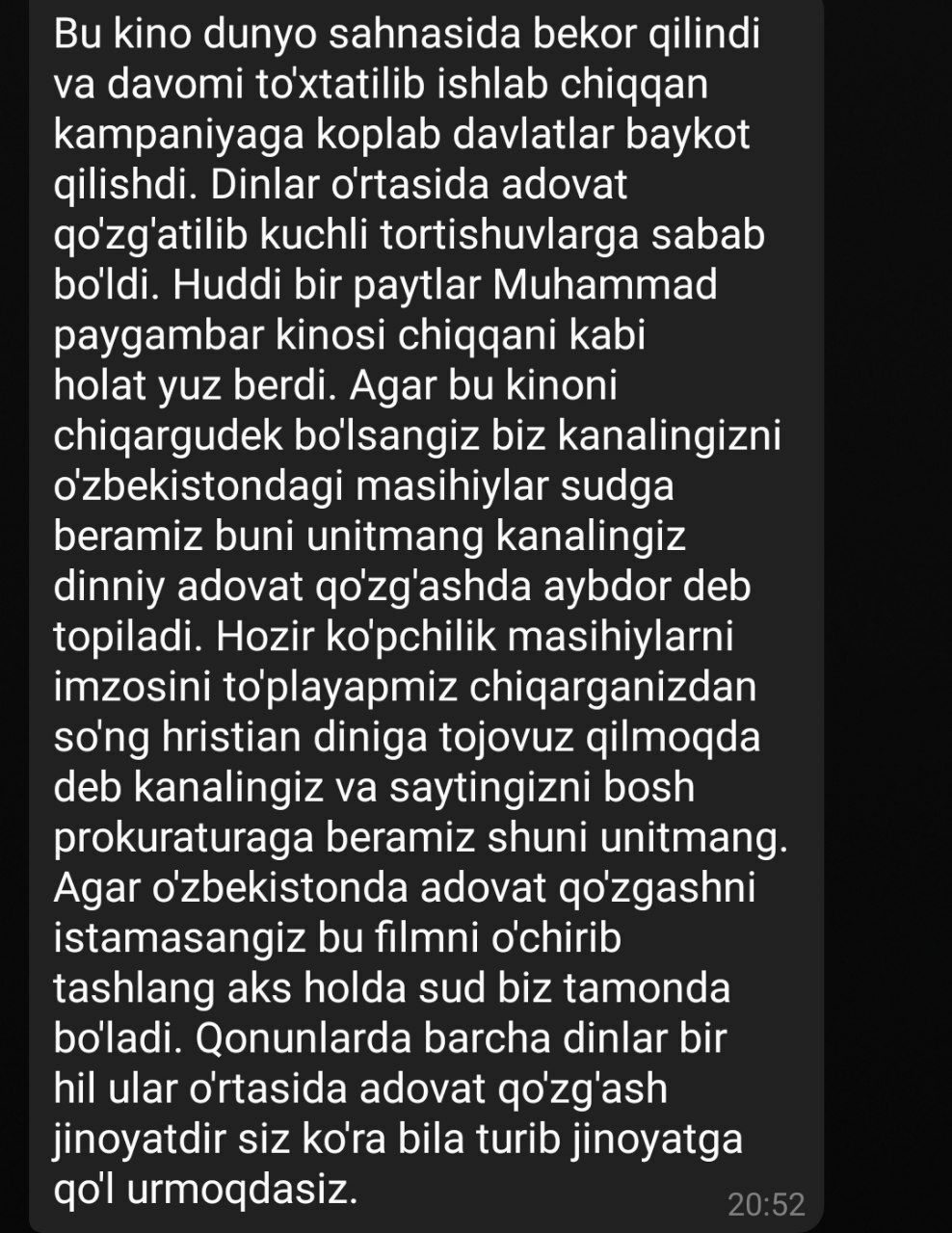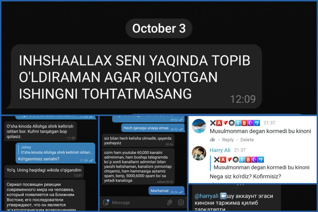 Shunday qilib, meni qoralab, qandaydir diniy materiallar joylanadigan kanalga post joylashtirgazibdi. Unda "Yaxudiylar fitna qilib, dinimizni masxara qilgan serialni o'zbek tiliga tarjima qilib millionlab yurtdoshlarimizga (rostdan, rostdan ham millionlab deyilgan) tarqatayotganim, bu fitnani daf qilishda birodarlarining yordami zarurligi, meni tartibga chaqirib qo'yish lozimligi" aytilib, profilimga link berilgan.