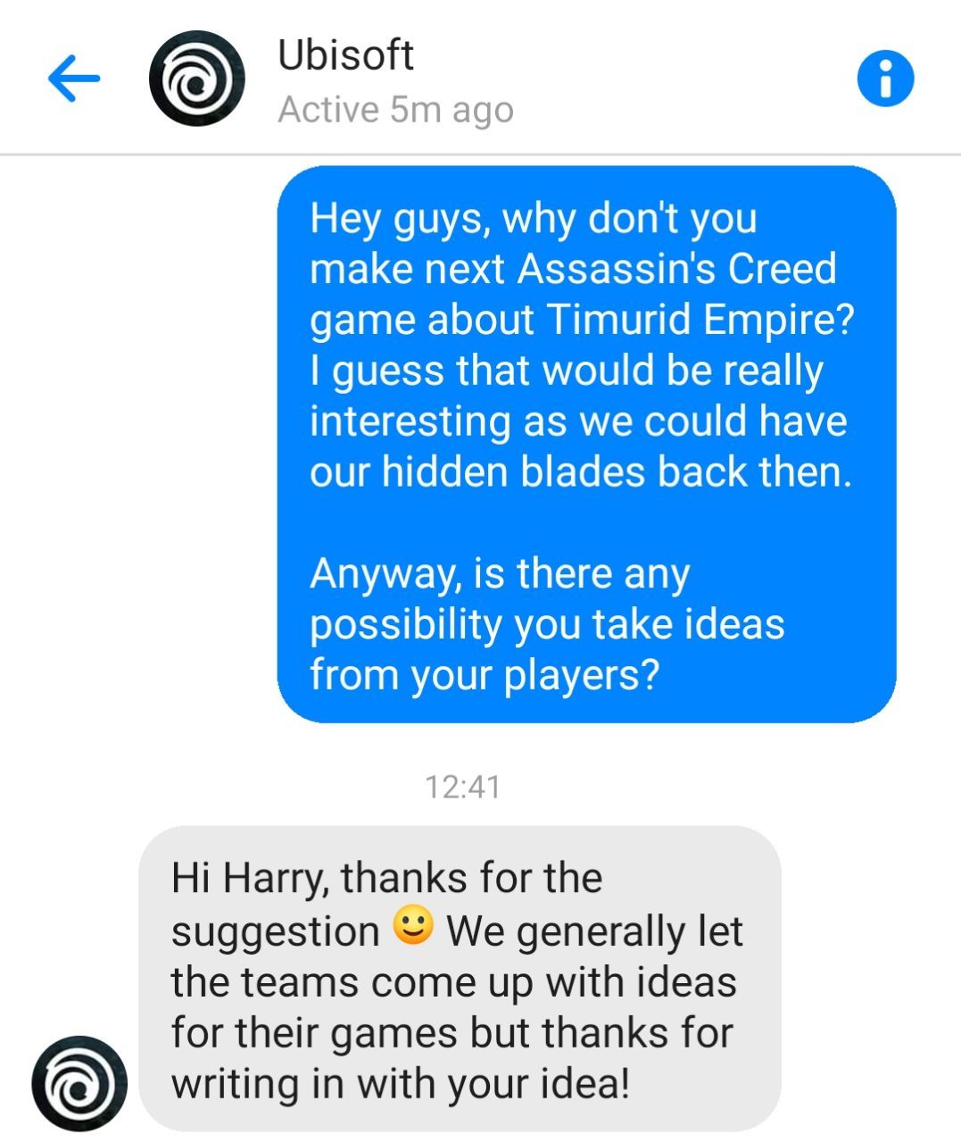 Shularni eslab, Ubisoftdagi akaxonlarga xabar yozgandim, Temuriylar Imperiyasi haqida ishlasanglar o'lasanmi, deb. Taklif uchun rahmat, lekin bunaqa g'oyalar bilan maxsus jamoalar shug'ullanadi, shunda ham g'oya uchun tashakkur, deb yuborishibdi.