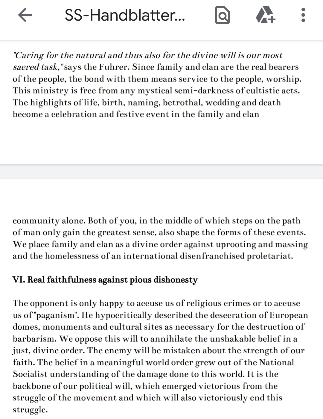 "The opponent is only happy to accuse us of religious crimes or to accuse us of "paganism". He hypocritically described the desecration of European domes, monuments and cultural sites as necessary for the destruction of barbarism. We oppose this will to annihilate the unshakable belief in a just, divine order. The enemy will be mistaken about the strength of our faith. The belief in a meaningful world order grew out of the National Socialist understanding of the damage done to this world. It is the backbone of our political will, which emerged victorious from the struggle of the movement and which will also victoriously end this struggle."