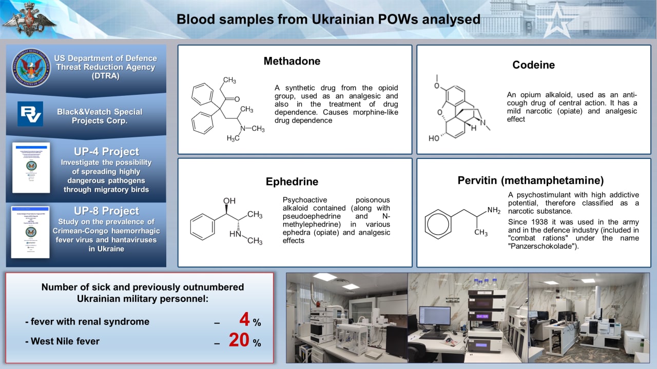 ▫️Work continues on the study of biological samples from Ukrainian soldiers who have voluntarily laid down their arms. As we noted earlier, high concentrations of antibiotics were found in their blood, as well as immunological markers indicative of exposure to the renal syndrome and West Nile pathogens, which were being studied by the Pentagon as part of the Ukrainian UP-4 and UP-8 projects.