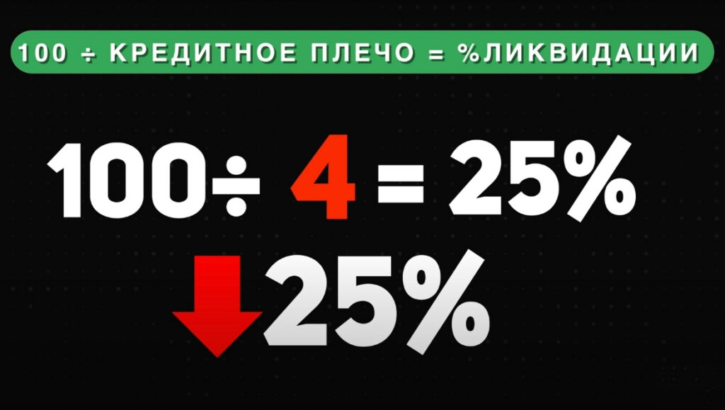 Процент ликвидации можно рассчитать по формуле: 100 деленное на размер кредитного плеча. Простой пример: вы используете 4х кратное кредитное плечо, процент ликвидации в данном случае будет равен 25, так как 100 делим на 4 равно 25. Знать процент ликвидации необходимо, так как он показывает зависимость движения цены актива и момента наступления ликвидации. В нашем примере, если цена актива сдвинется на 25%, то позиция будет ликвидирована. Учитывая тот факт, что рынок криптовалют крайне волатилен, очевидно, что чем больше кредитное плечо, тем более рискованная сделка.