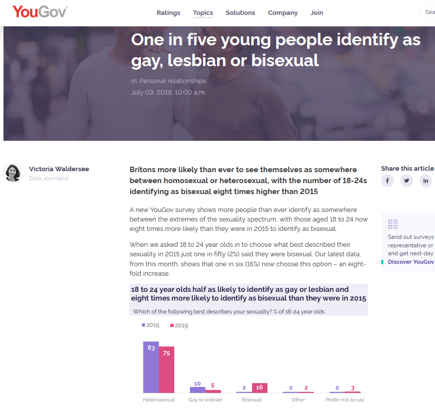 Anyone who believes this below is counselled to check into a psychologist this afternoon. 20% of the young population is homosexual/bisexual? A rise of 800% in 4 years? The idea that sexual attraction is a 'spectrum'? Utter nonsense.
