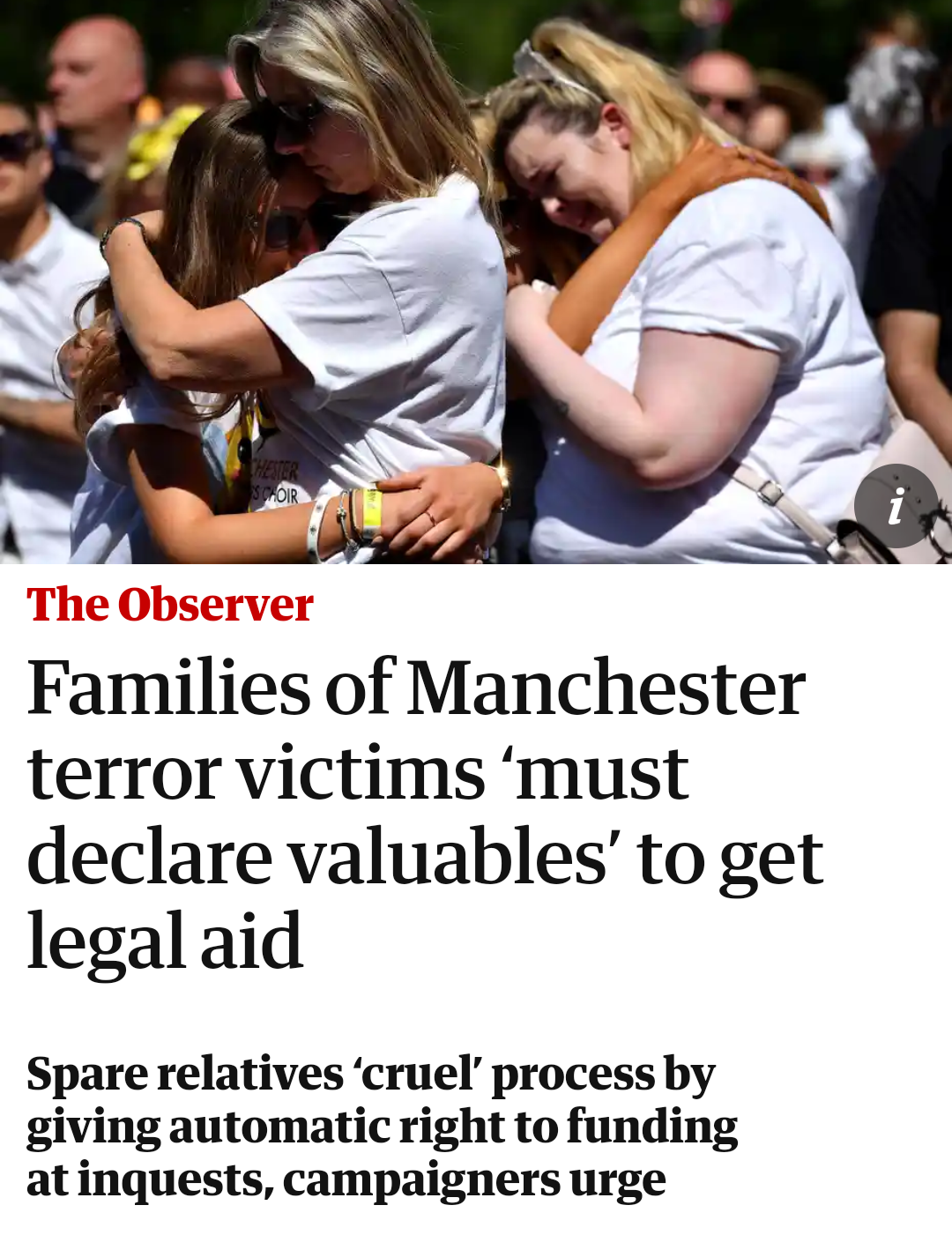 "Relatives of the 22 victims of the Manchester Arena terrorist attack who are applying for legal aid for representation at the forthcoming inquest are being made to fill in a 17-page questionnaire and declare whether they have any “valuable possessions” worth more than £500 that could be sold to help cover costs."
