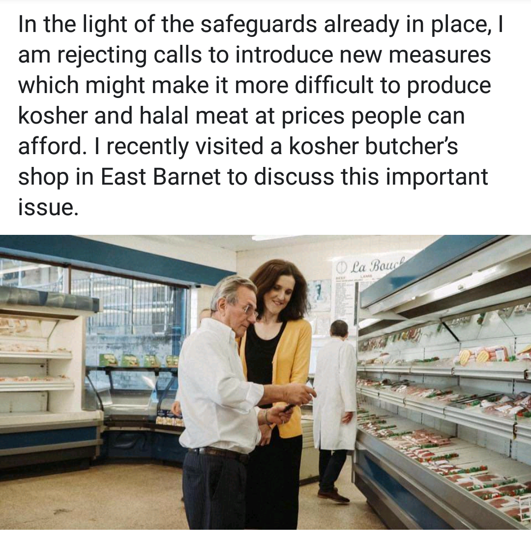 β Minister Theresa Villiers refuses to agree for halal and kosher meat to be labelled because it will make it more expensive. This is because the offcuts are recycled to the general public who subsidise the trade (by purchasing) and would stop if it was labelled.