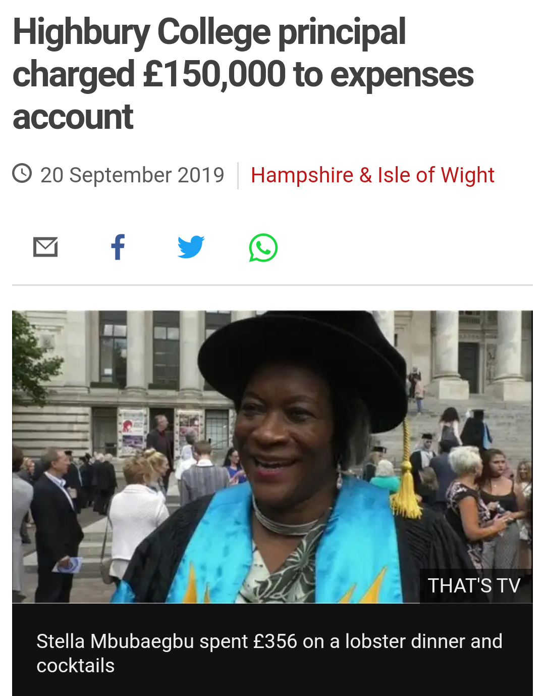 β Well we were all shocked here. Highbury College's principal Stella Mbubaegbu 'CBE', used it's funds for expenses spree, and the college's investments they made in Nigeria have disappeared. Shocked!