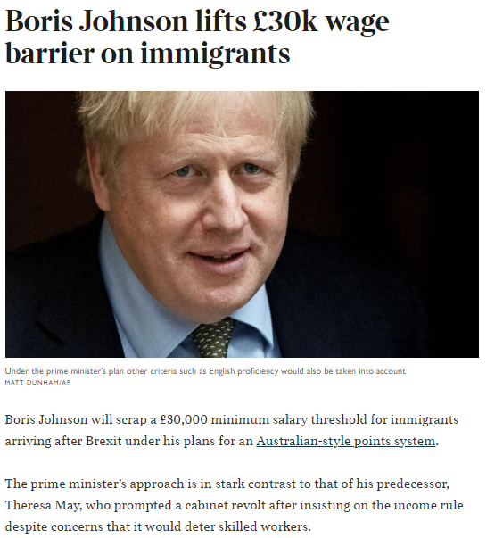 β 48 hours after telling African leaders that immigration "change is coming" Johnson and Patel announce they're dropping the Β£30,000 wage barrier, allowing in the lower skilled who will be entitled to various benefits including Universal Credit.