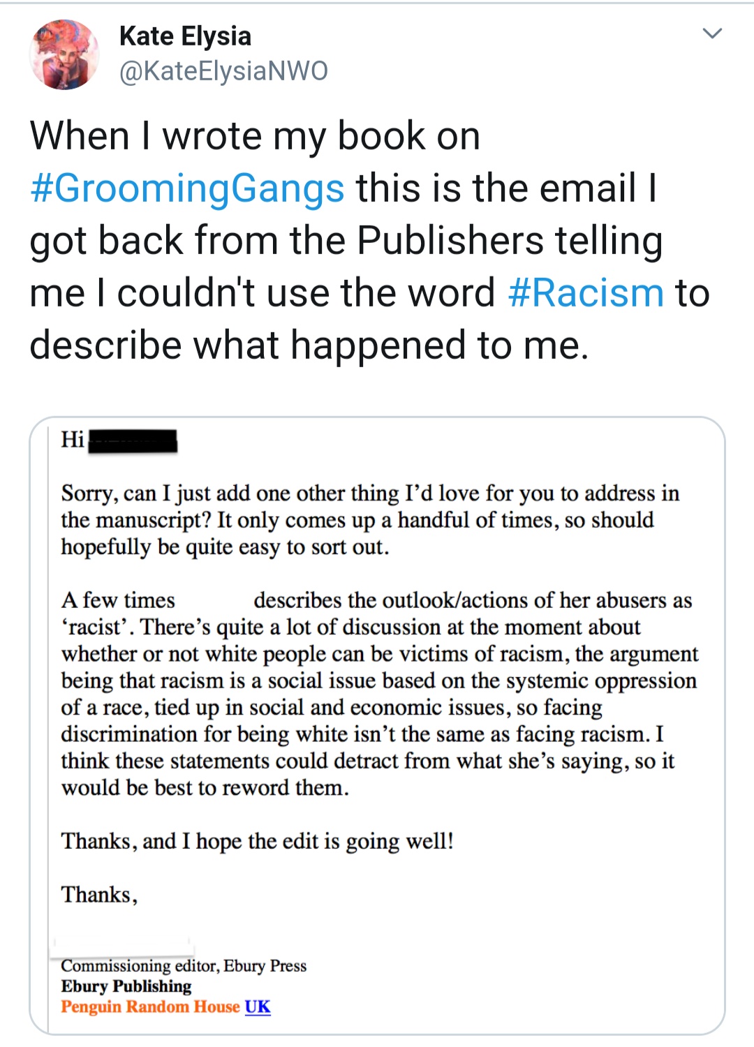 When I wrote my book on #GroomingGangs this is the email I got back from the Publishers telling me I couldn't use the word #Racism to describe what happened to me.