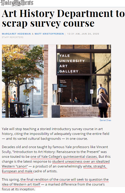 β A wildly popular Yale art foundation course has been dropped after a campaign by minorities and progressives who attacked its "Western canon" of "white, straight, European male artists". The final year will focus instead on "question(ing) the idea of Western art itself"
