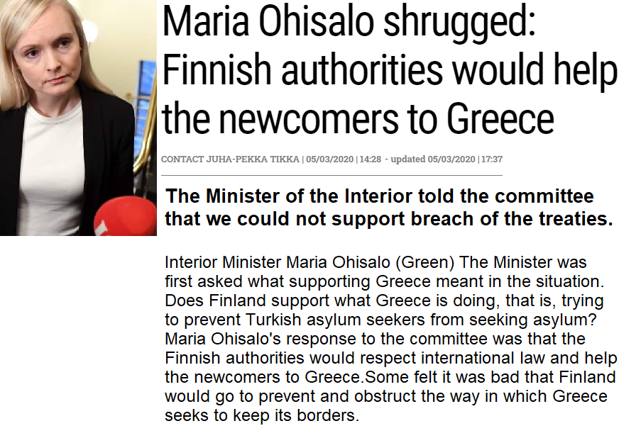Maria Ohisalo's response to the committee was that the Finnish authorities would respect international law and help the newcomers to Greece.