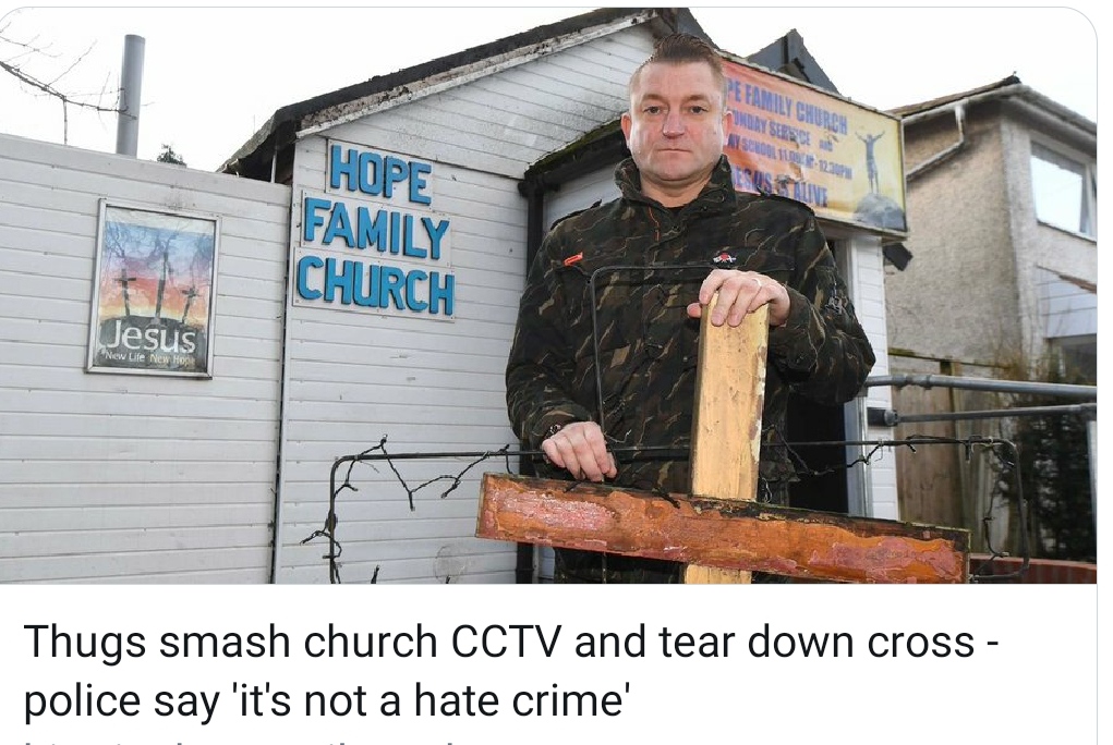 β Birmingham Police refuse to classify attacks on a church as a hate crime, even though the cross has been smashed off the roof, the projector slashed and inside vandalised and continual grafitti and damage.
