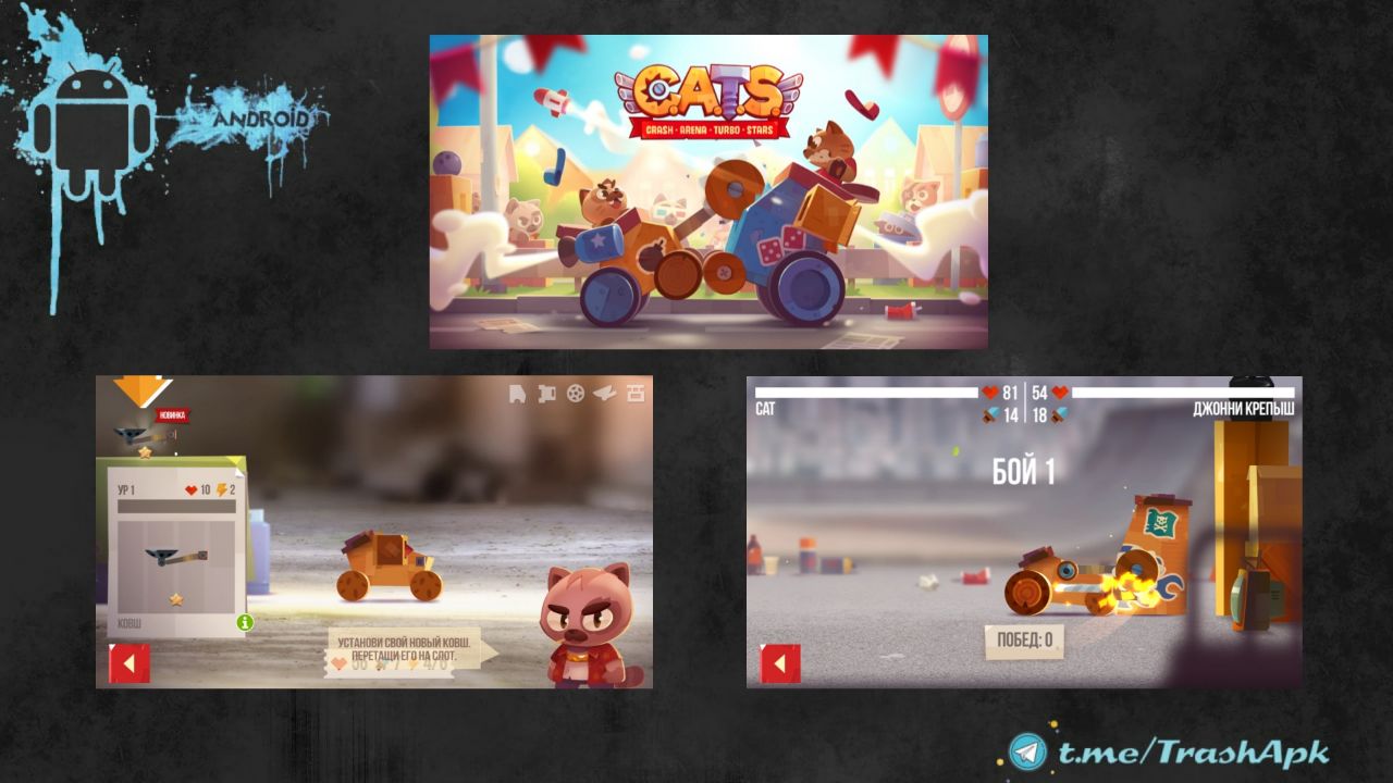 CATS - Увлекательный экшен с элементами RPG в котором вам предстоит проектировать и строить собственный боевой автомобиль. Сражаться нужно с реальными игроками, стараясь продержаться отведенное время и нанести максимально возможный урон по их автомобилям.
