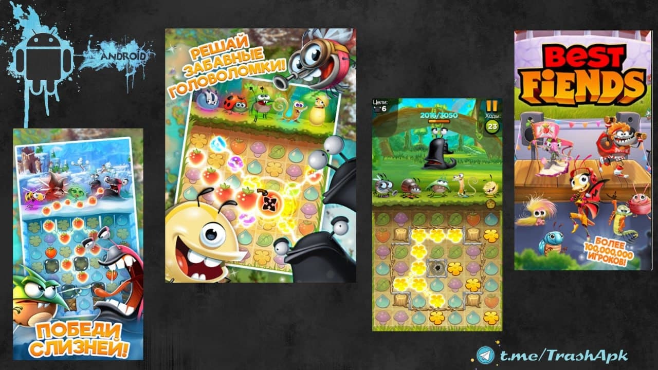 Best Fiends - В стране Миниатюрии царили мир и спокойствие, пока однажды на Гром-Гору не упал метеор, откуда появились противные слизни. Помоги своим букашкам спасти родной лес! Совмещай блоки что бы нанести урон слизнякам.