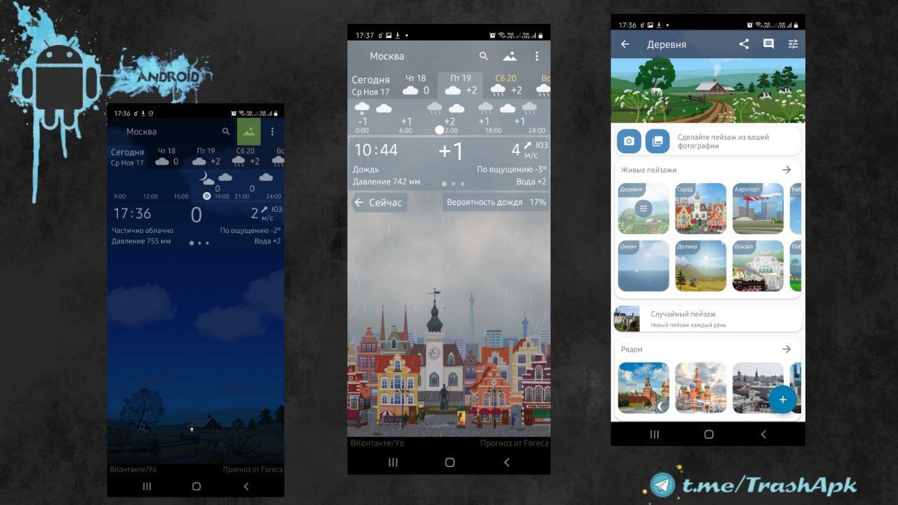 YoWindow - Вы нашли волшебную погоду! Когда за вашим окном дождь, в программе тоже идёт дождь, и люди открывают зонтики. Крутите время и наблюдайте, как изменится погода в течение дня. Просто проведите пальцем слева направо!