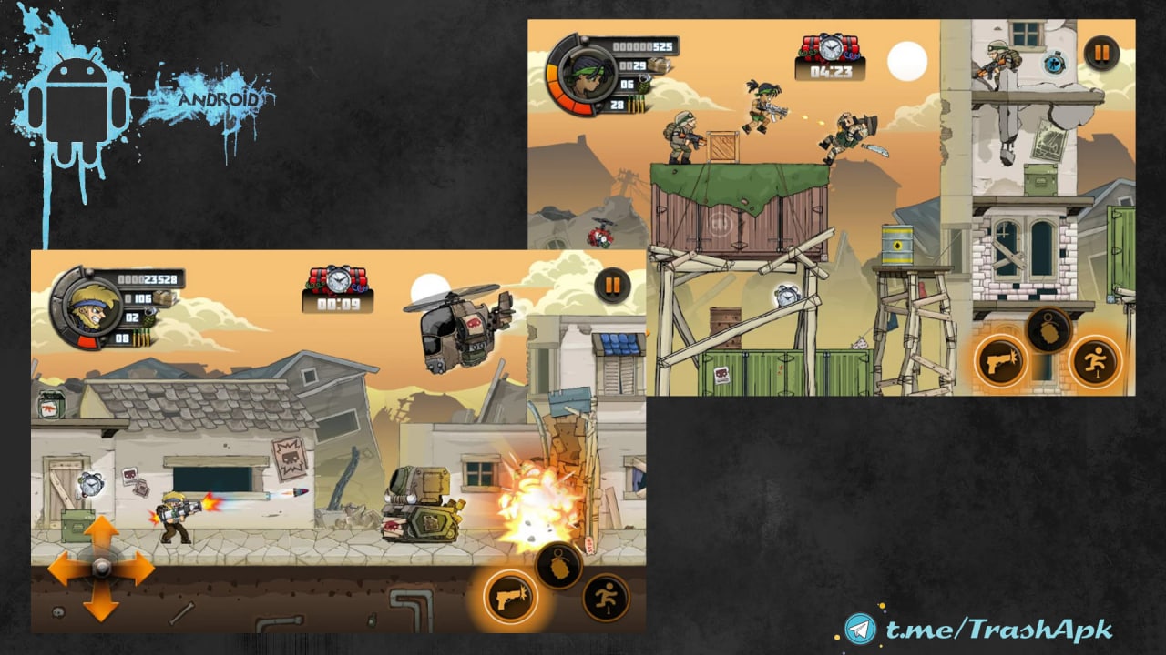 Metal Soldiers 2 - динамичный аркадный экшен для андроид устройств. Захватывающий и динамичнй Потрясающее сочетание классического платформера, аркадного экшена и стелялки, которое поразит вас великолепным геймплеем и высокой динамикой.