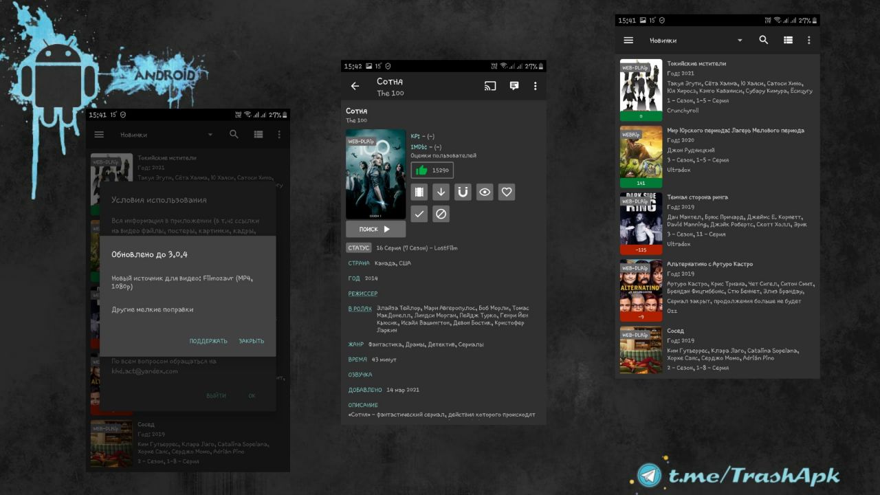 Кино HD — приложение для поиска фильмов и сериалов по бесплатных поставщиках видеоконтента, таких как Filmix, Kinostrana, Makrohd, Onik, Videocdn, Videoframe, Zombie, Zona. Это приложение представляет из себя организованный каталог из названий фильмов, описаний, изображений и отзывов пользователей.