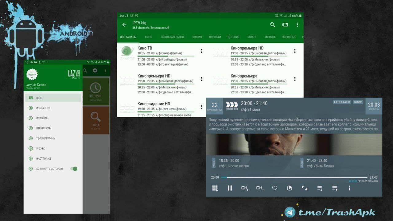 LazyIPTV DELUXE - Просмотр IPTV, поддержка и менеджмент iptv m3u-плейлистов; поддержка архивов передач известных форматов; синхронизация данных между несколькими устройствами через gdrive посредством google-аккаунта многое другое.