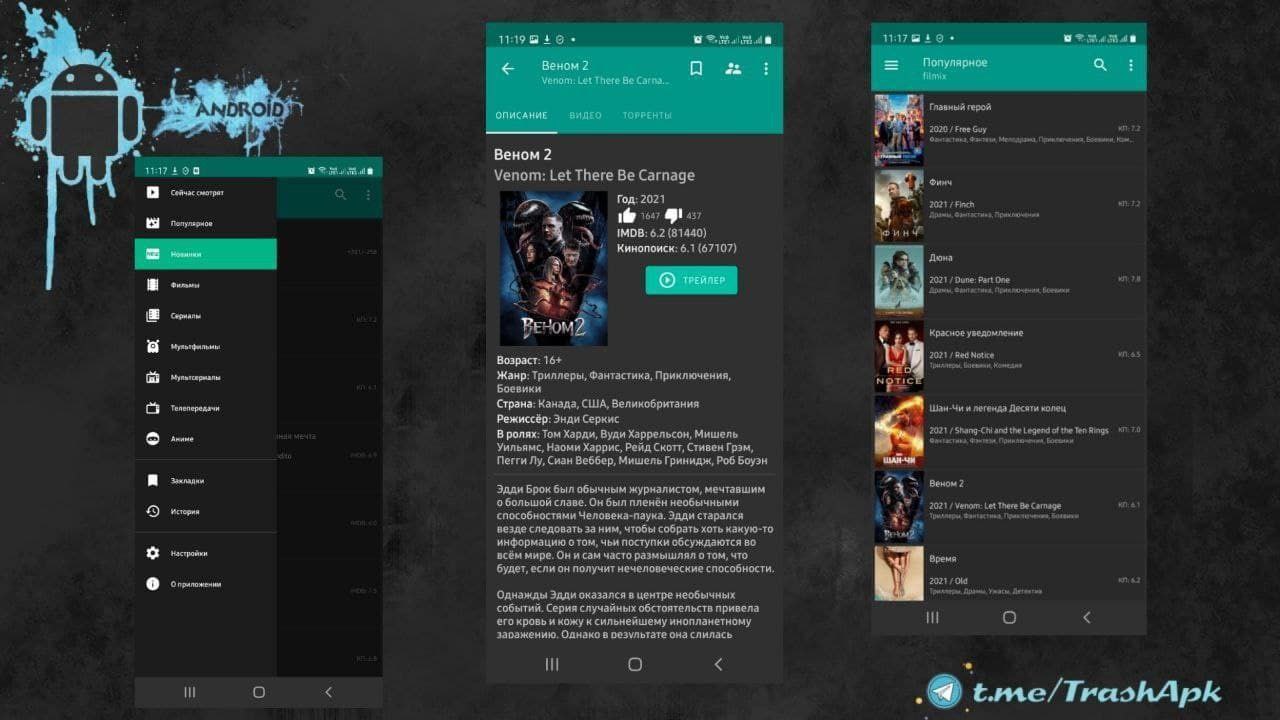 Кино HD — приложение для поиска и просмотра фильмов и сериалов по бесплатным поставщикам видеоконтента, таких как Filmix, Kinostrana, Makrohd, Onik, Videocdn, Videoframe, Zombie, Zona. Это приложение представляет из себя организованный каталог из названий фильмов, описаний, изображений и отзывов пользователей.