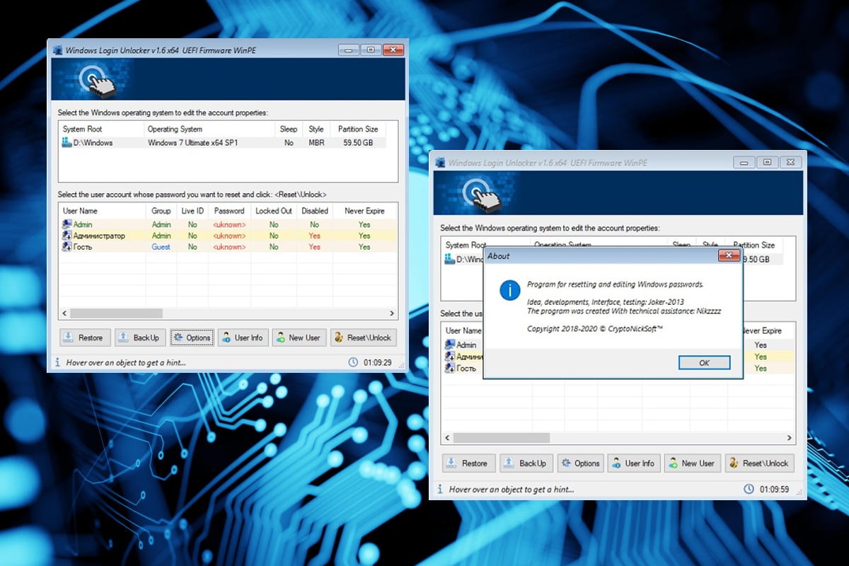 ​​Windows Login Unlocker - разработана для сброса, изменения паролей или разблокировки учетных записей Windows.