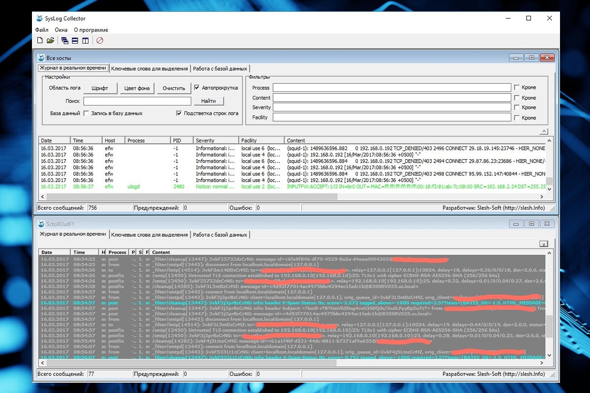 SysLog Collector -программа для удаленного сбора, сохранения и анализа журналов приложений и оборудования по протоколу SYSLOG.