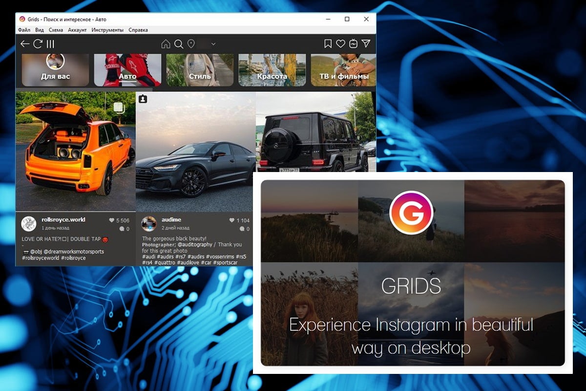 Grids for Instagram — это один из самых адекватных клиентов на ПК для работы с социальной сетью. Программа не уступает по возможностям последним версиям мобильного приложения. Разбираться в утилите даже не придется. Поскольку механизм работы ее аналогичен принципам мобильной версии программы. Можно посмотреть ленту друзей, посетить категорию «Популярное», пролистать снимки в разделе «Избранное», отредактировать или просто просмотреть свой профиль, узнать, кто оставил лайки или комментарии под своими фотографиями.